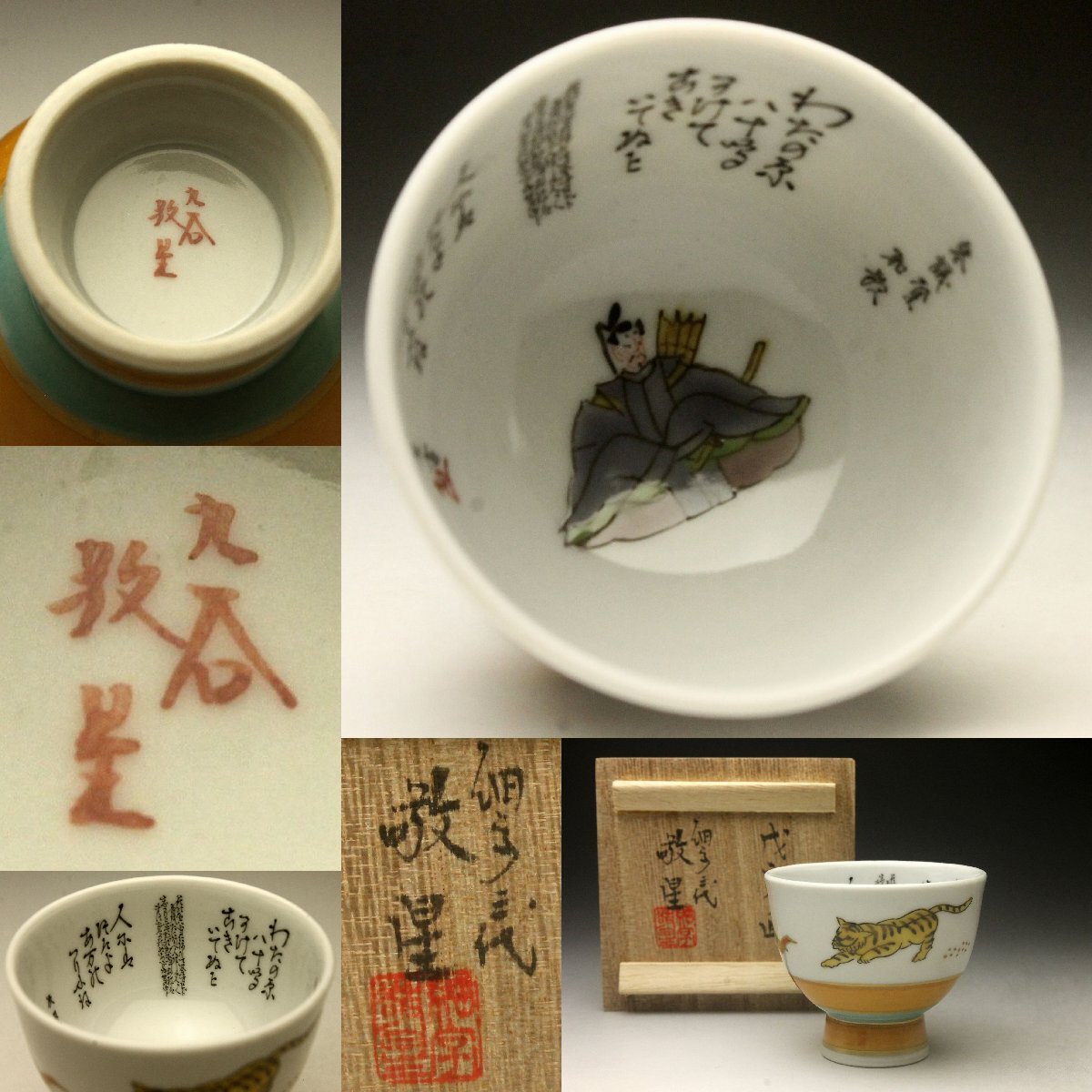 - 【余韻】 田村敬星作 毛筆細字技法 『藤原定家 御歌』盃★箱 共布 九谷焼 寅歳画 酒器 ぐい呑み 色絵<同梱可>