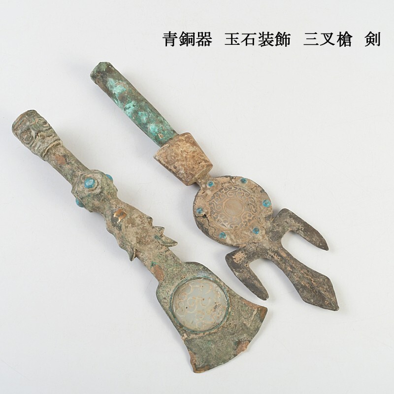 - 中国美術 青銅器 玉石装飾 三叉槍 剣 2点 合わせ箱 VAMP