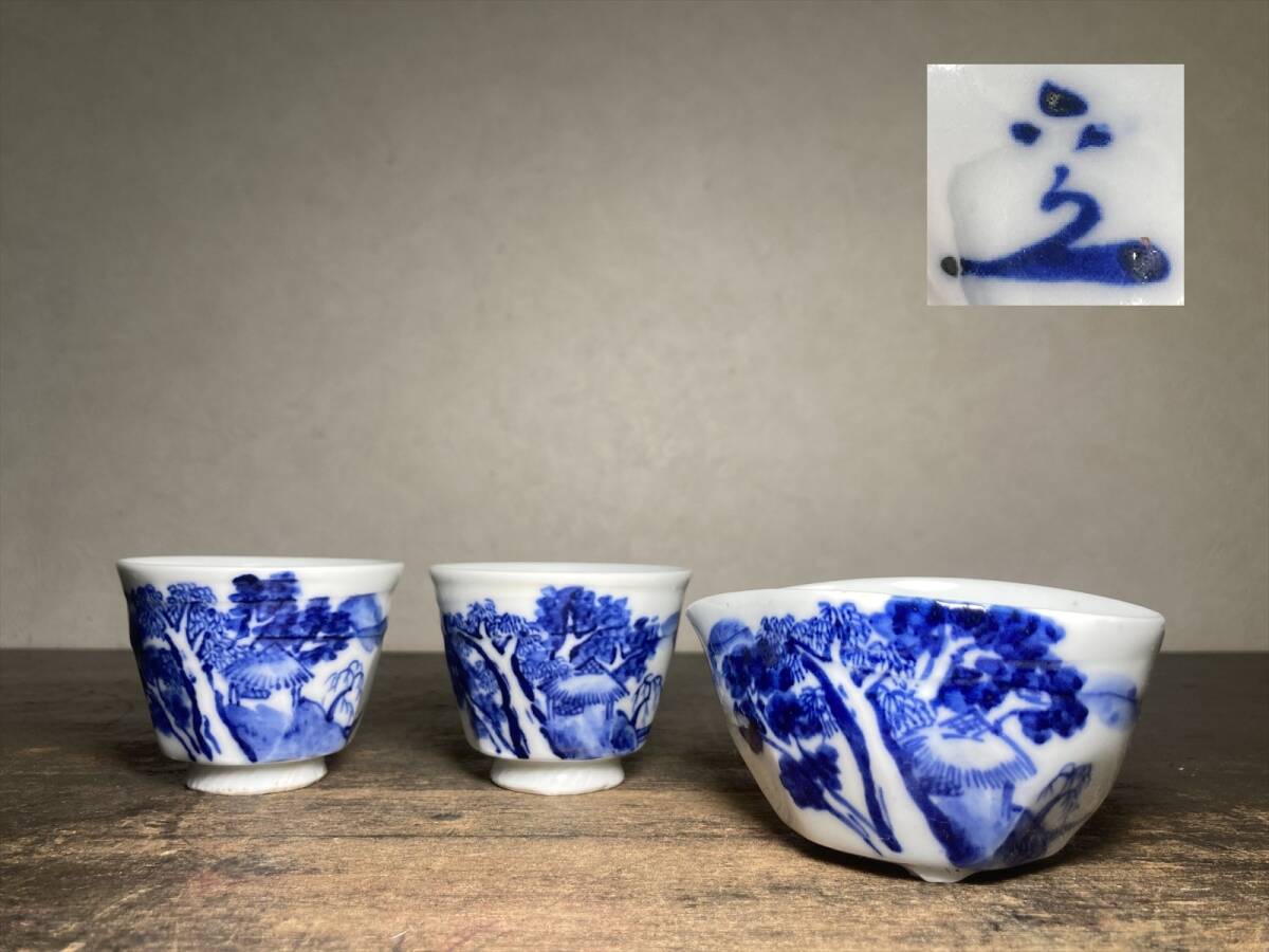 - 京都6☆ 茶道具 名工 清水 六兵衛 湯呑 2客 湯冷まし 山水図 煎茶道具 染付 古物 骨董品