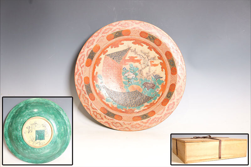 - 時代物 古九谷 五彩手 大皿 経39.7cm 木箱附 (T152)