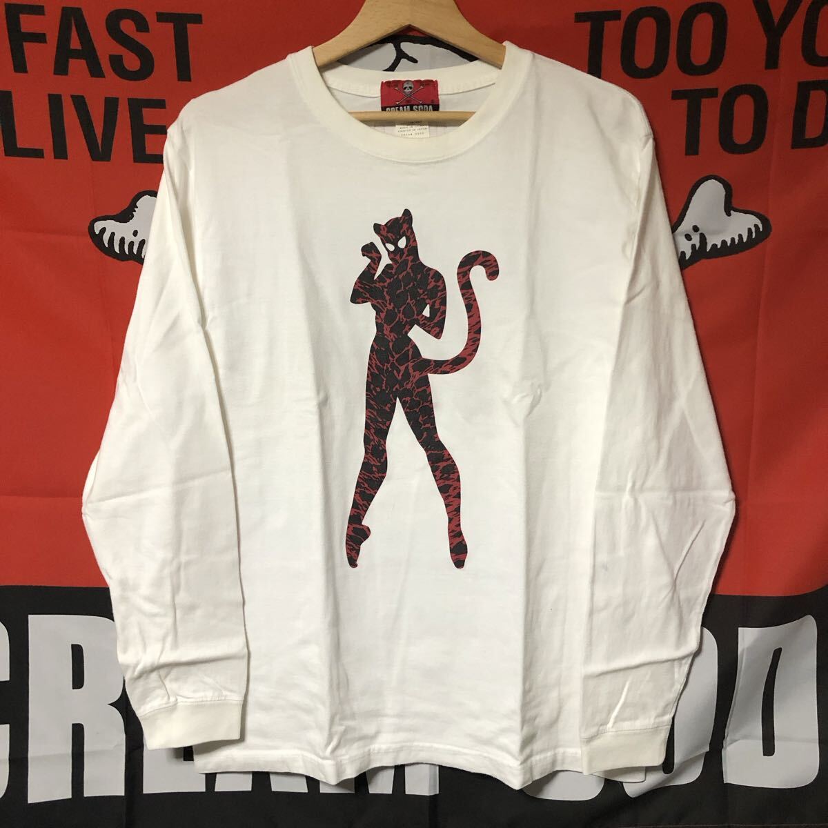 > クリームソーダ ヒョウ柄 立ち猫 ロンT 長袖 Tシャツ 白 Lサイズ CREAM SODA ブラックキャッツ ピンクドラゴン ロカビリー