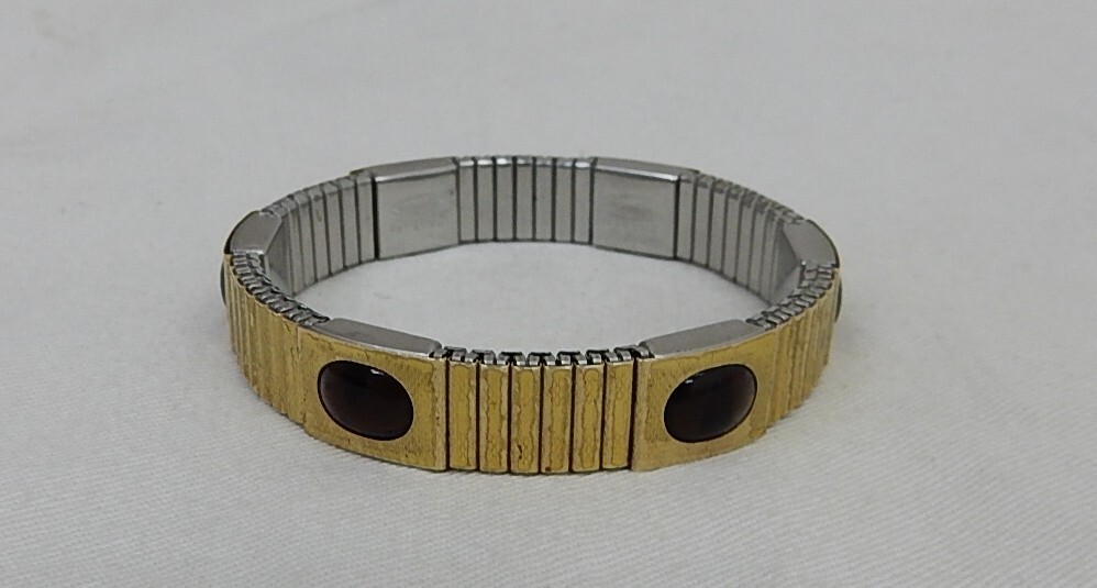 - 【中古保管品】★ヴィンテージ Aimante Pat. 269121 ブレスレット 伸縮ベルト 金色/シルバー色/ブラウンストーン MADE IN JAPAN