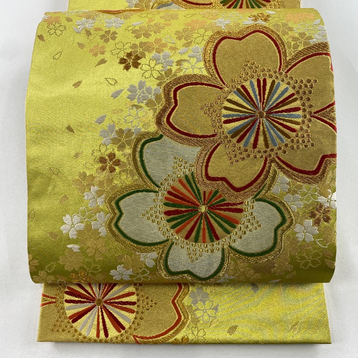 > 【美品】 袋帯 秀品 振袖向き 桜 花びら 金銀糸 箔 金色 六通 正絹 【中古】