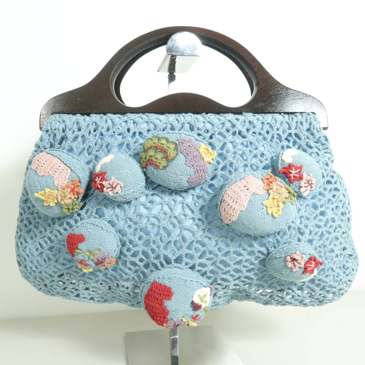 > ワンダフルワールド・カネコイサオ★可愛い!かぎ針編みモチーフ刺しゅう ニットハンドバッグ くすみ水色系 *k4308