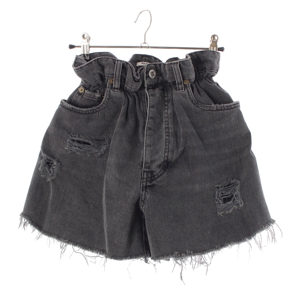 - ミュウミュウ コットン ロゴ ダメージ加工 ゴムウエスト デニム ショートパンツ GWP300 ブラック 25【中古】