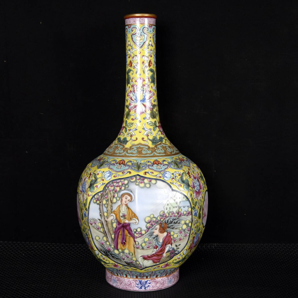 - NA131■清朝時代 乾隆年制款 黄地琺瑯彩描金開光西洋人物紋 八稜胆瓶 時代物 古玩 唐物 古陶磁器■
