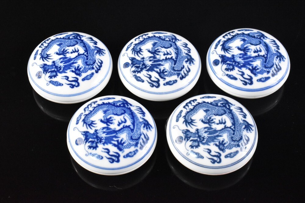 - 【雲】某名家委託品 中国 染付 雲龍絵付 朱肉入 まとめて 古美術品(書道具旧家蔵出) F8616