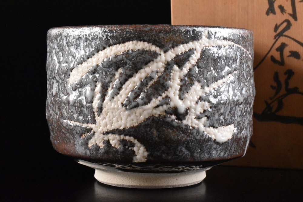 - 【雲】某名家収蔵品 美濃 茶釉花絵付抹茶碗 在銘 共箱 古美術品(茶道具旧家蔵出) F8642