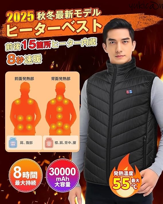 - 電熱ベスト ヒーターベスト L 15箇所発熱 30000mAh 防寒 速暖 保温 超長連続使用時間 オートモード付き 省エネ 水洗い可 男女兼用 節電