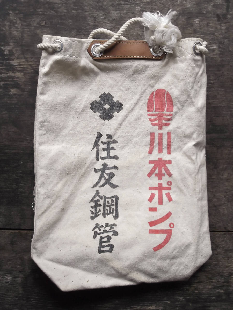 - 昭和 レトロ 帆布 道具袋 川本ポンプ 住友鋼管 社章 商店 ノベルティ 工具袋 大工道具 職人 ビンテージ 検/ 古布 木綿 巾着袋 酒袋 古道具