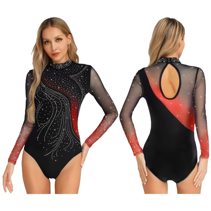 - 大きなXLサイズ 黒赤・IEFIEL社製 長袖フィギュアスケートレオタードクリスタルラインストーンボディスーツバレエ体操ダンス ウエア