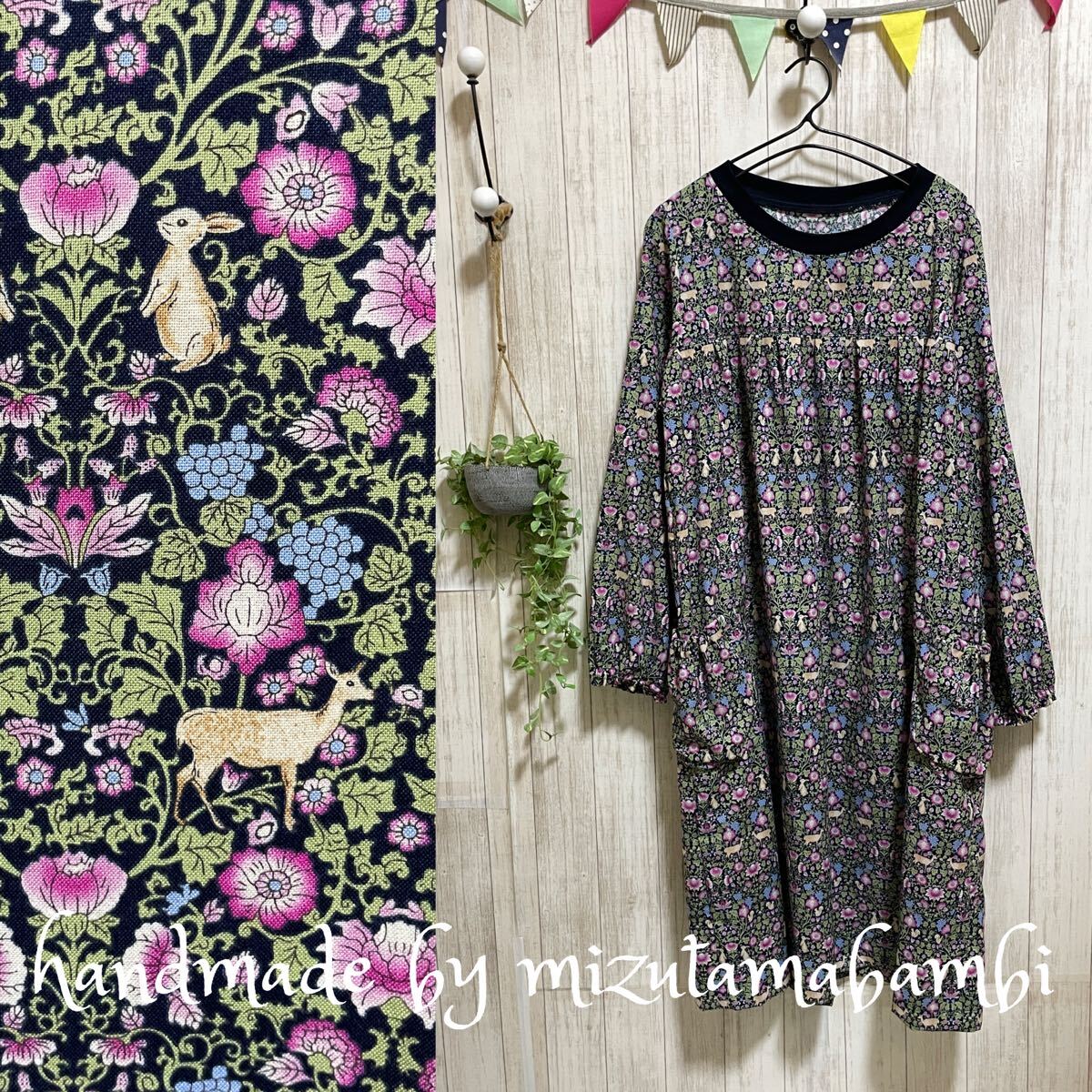 - **L〜LL(ひざ下丈・長袖) **森の動物たち(紺)のひざ下丈OP**水玉バンビハンドメイド**