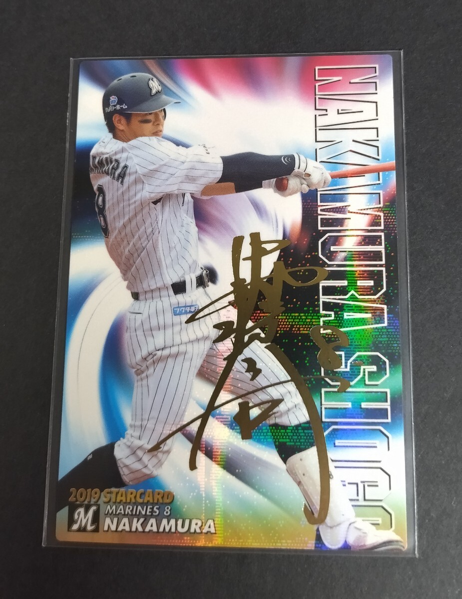 > 2019年カルビー 第1弾 中村奨吾(ロッテ)金箔サイン入りスターカード。No,S-09。