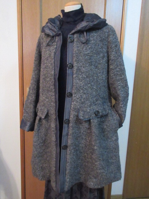 > F’)■【noa-ge ノアジェ】■グレー&黒■毛41%綿41%■ドロー紐付きふっくら2段襟&前立て襟/襟/袖口には異素材コラボ!■コート■