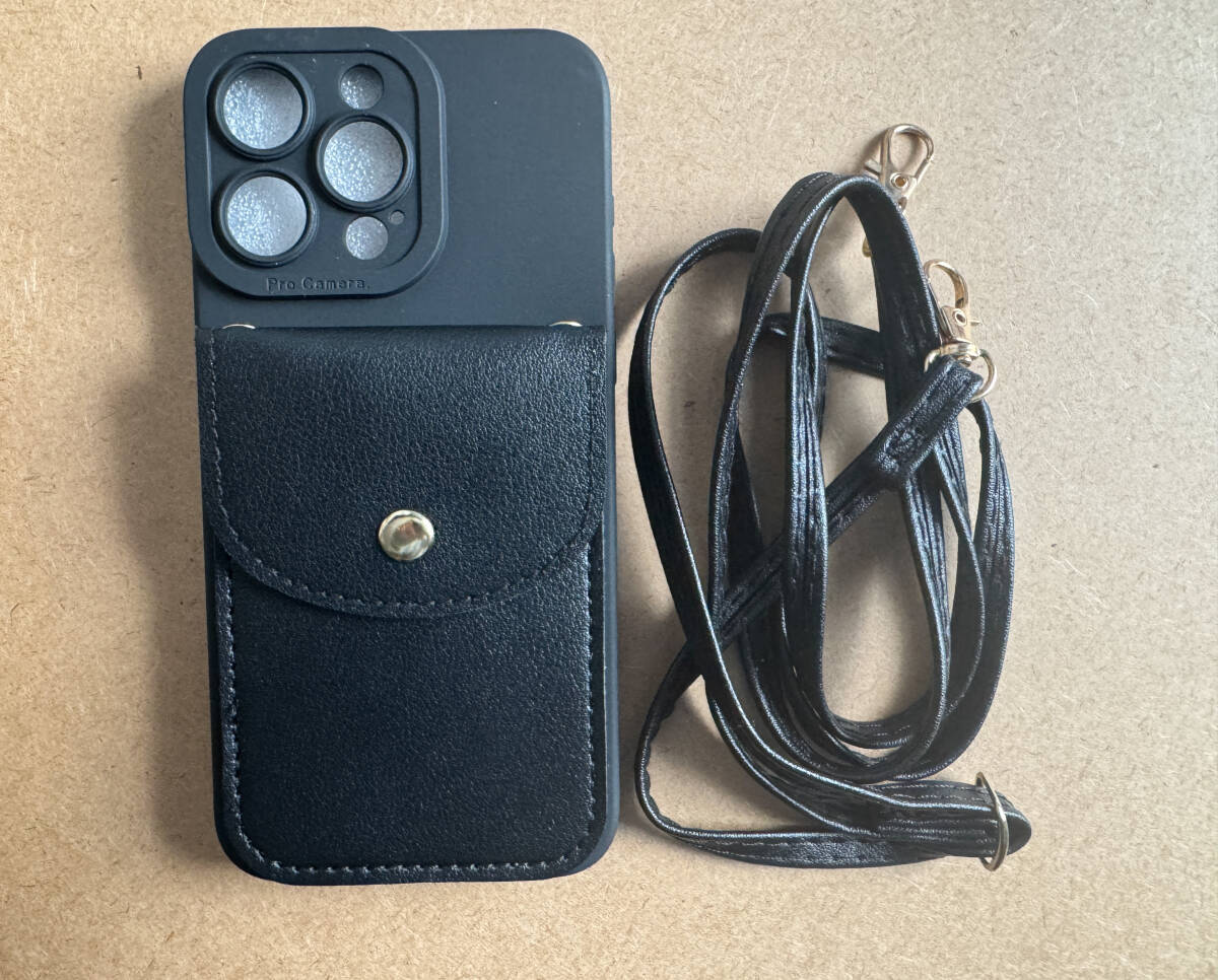> 新品★iPhone 15 pro max★ショルダーストラップカード入れ付ケース 黒色★ネックストラップ フェイクレザー