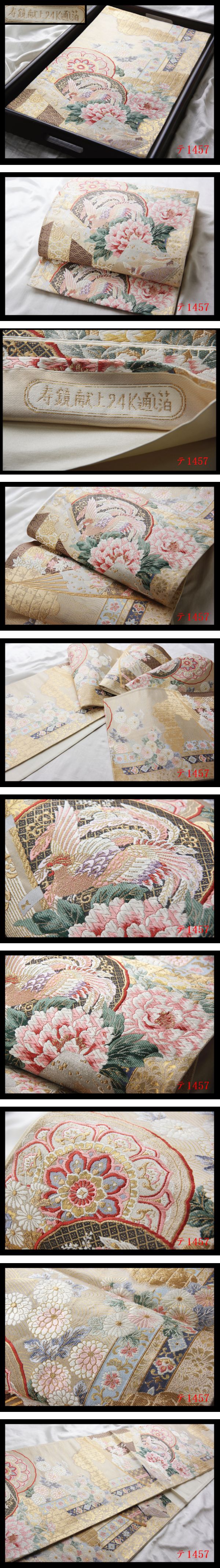 > 蔵【テ1457】西陣逸品 振袖可 寿鏡献上24K通し箔 ベージュ色地 気品豊かに 正絹六通高級美術袋帯◇検◇簪着物名古屋帯和装小物帯締め