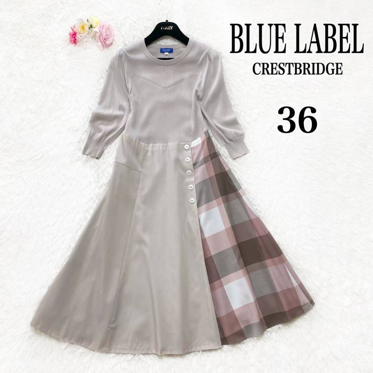 > ブルーレーベル クレストブリッジ ソフティーツイル ニット コンビ ワンピース 未使用 タグ付き エクリュ 36 チェック ひざ丈 フレア