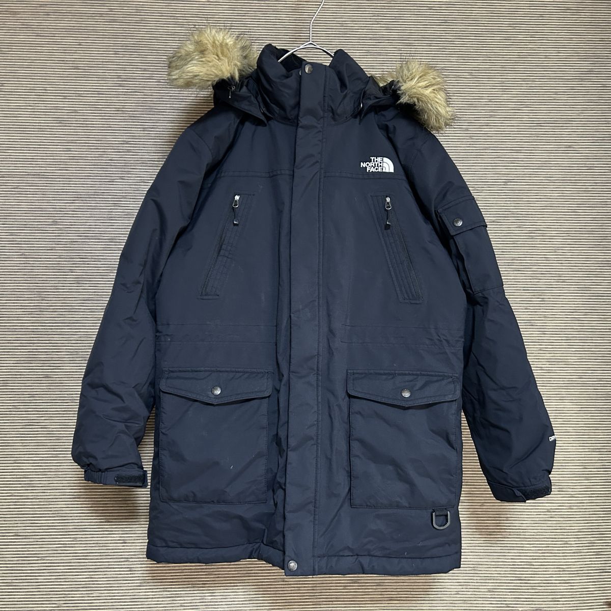 > ノースフェイス ダウンジャケット モッズコート 黒 子供150 刺繍 ファーH1 古着 入手困難 激レア 希少 人気 ドライベント キッズ