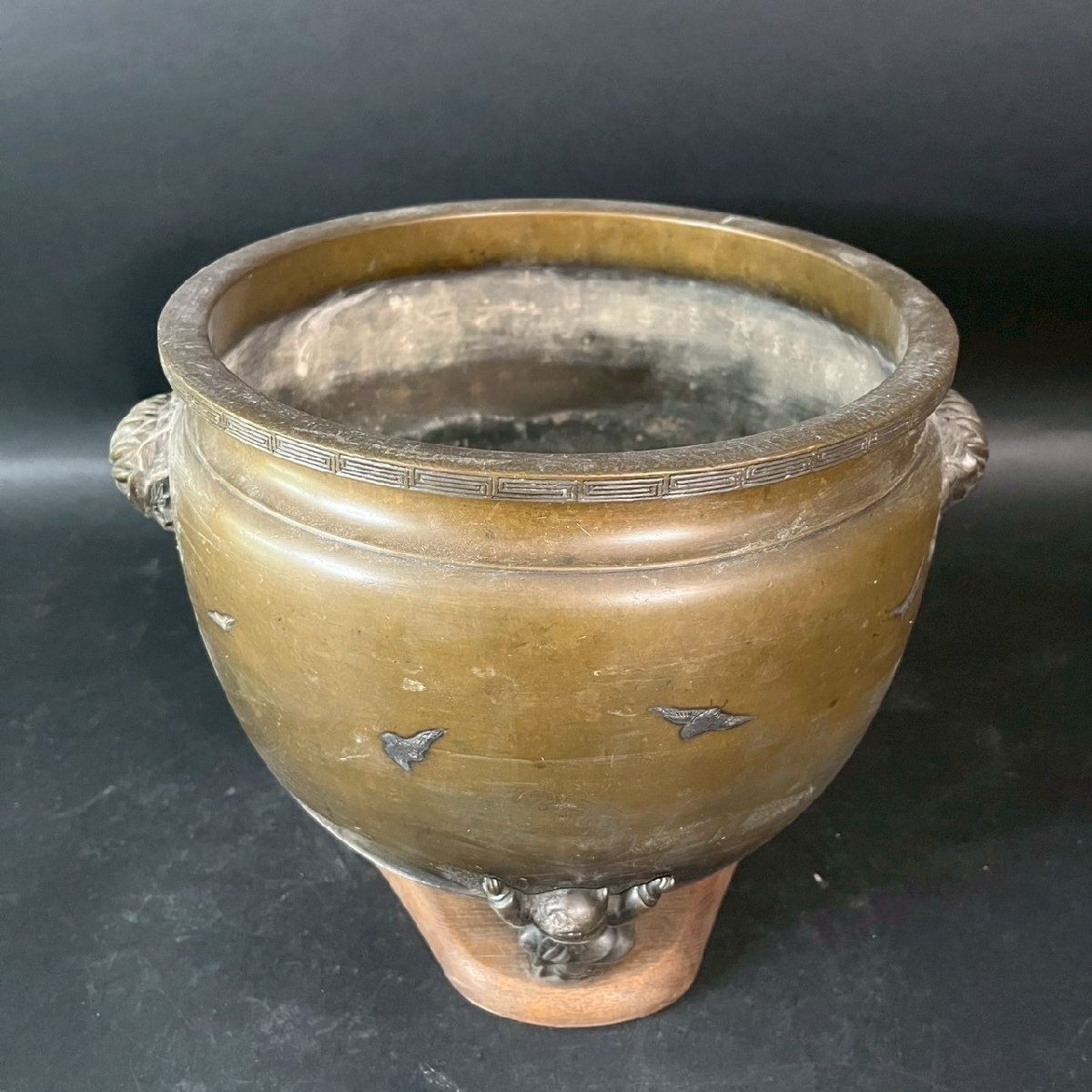 - OM0917-20‐3 火鉢 鉢 大型 銅器 銅製 古銅 丸火鉢 古木台座 古民具 料理 囲炉裏 伝統 工芸 彫刻 骨董品 高さ23.5㎝ 口径23㎝ 100サイズ