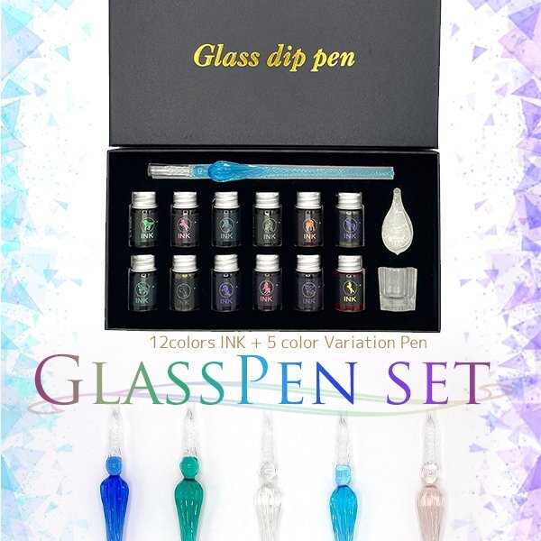 - 送料無料 ガラスペンセット インク12色付き 一式 スターターセット ペン置き ガラスペン カリグラフィー文字 クリーニングカップラメインク