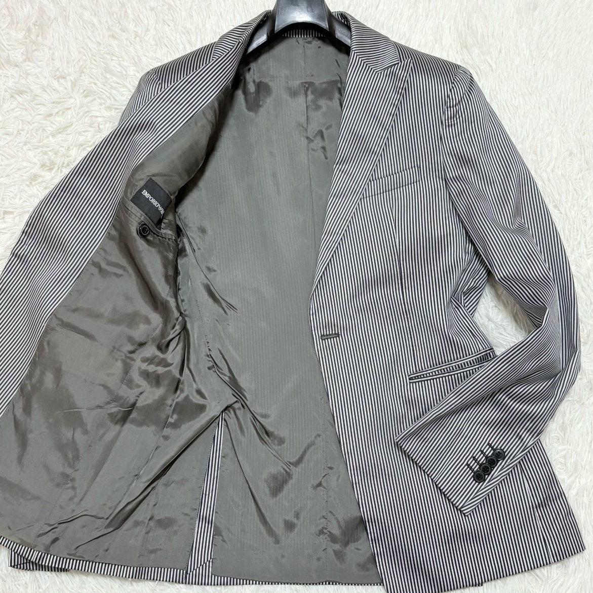 > 美品◎Lサイズ EMPORIOARMANI エンポリオアルマーニ シルク混 テーラードジャケット ストライプ 黒タグ 1B グレー ブラック 総裏 48