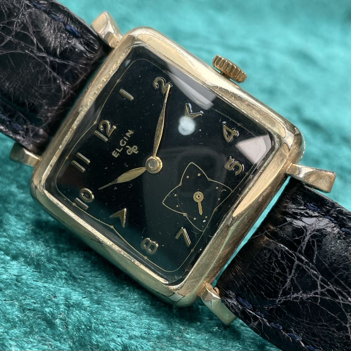 ビンテージ 希少 ELGIN エルジン アールデコ Cal.683 オリジナルケース 6735 50年代 角金 ゴールド ブラックミラーダイヤル 美品