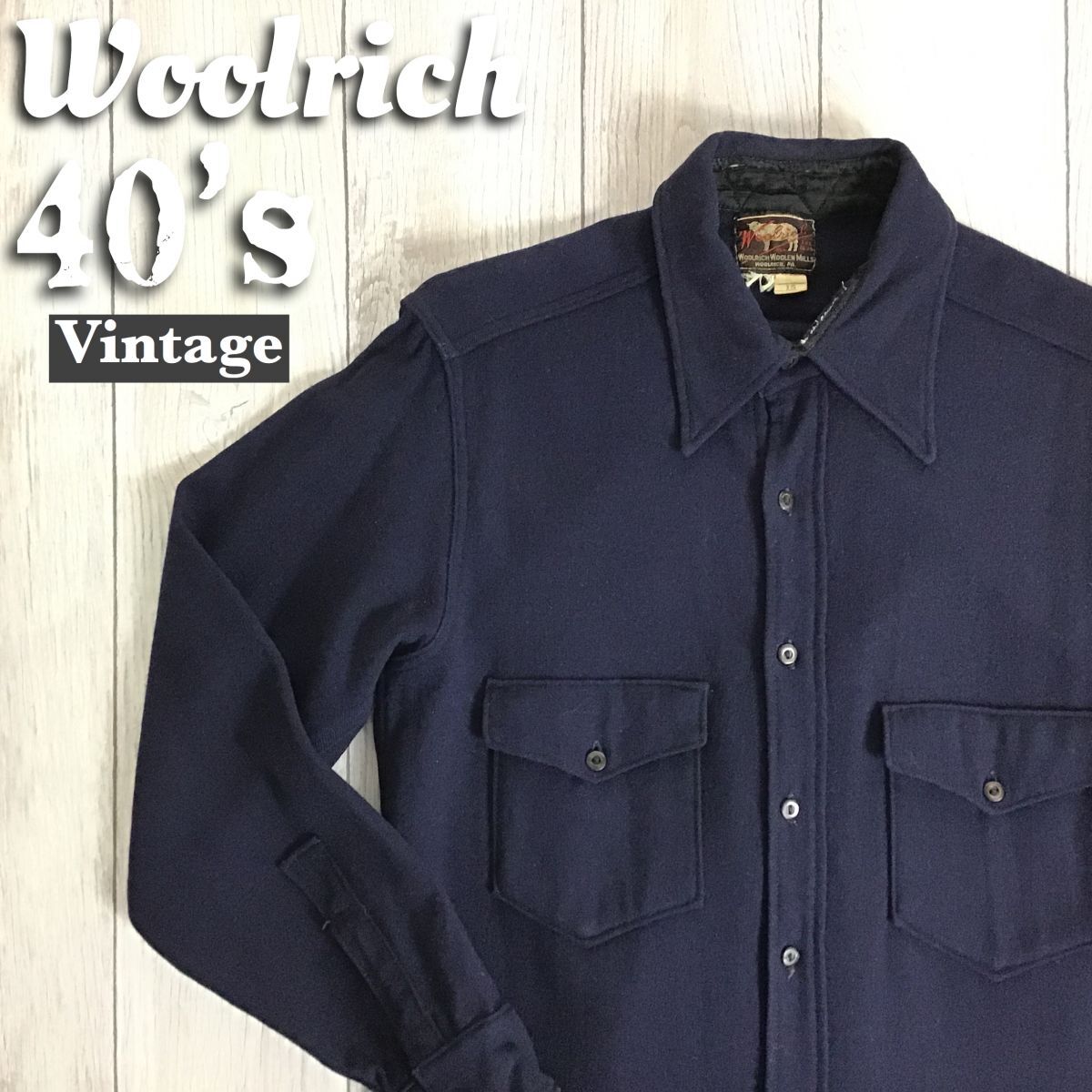 > ◎稀少レア品◎40's vintage◎[Woolrich ウールリッチ]黒タグ REG 筆記体 無地 長襟 長袖 シャツ[15]紺 アウトドア ビンテージ古着 K2-266