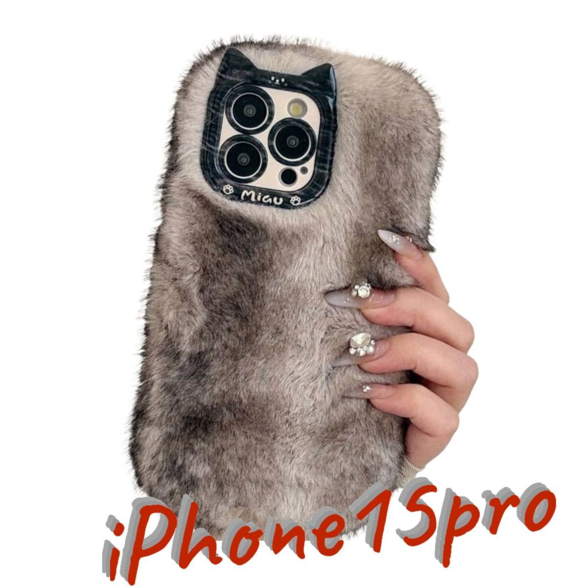 - iPhone15Pro ファーケース 猫耳付き グレー系 ふわもこ