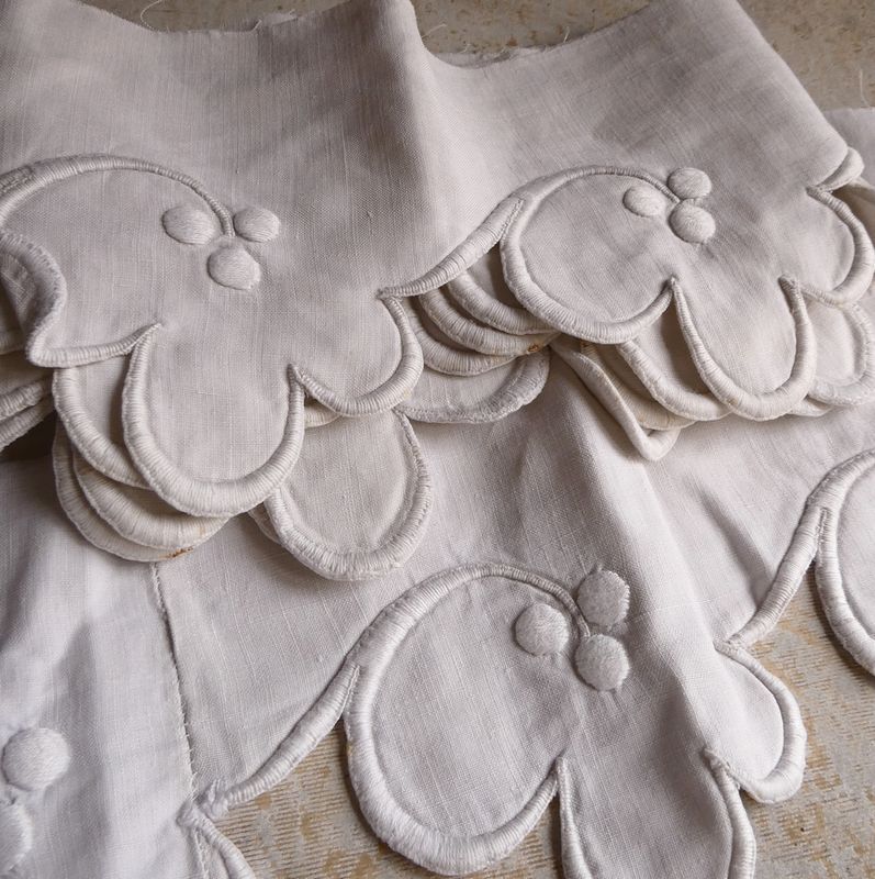- 2.4m アンティーク スカラップ 手刺繍 生地 レース フランス 手作り シーツ素材ピローケース装飾ハンドメイド材料リメイク手仕事ブロカント