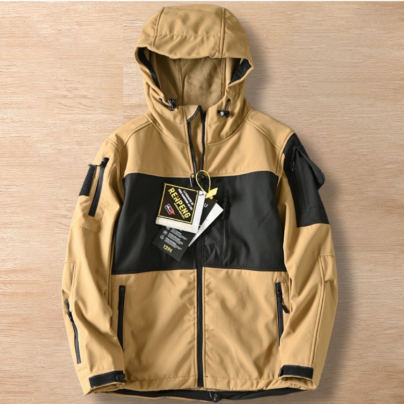 - Y855-XL カーキ 新品 ソフトシェルジャケット アウトドア 裏起毛 フード付き 防風 秋冬 暖かい 防寒 バイカラー アウター メンズ トップス