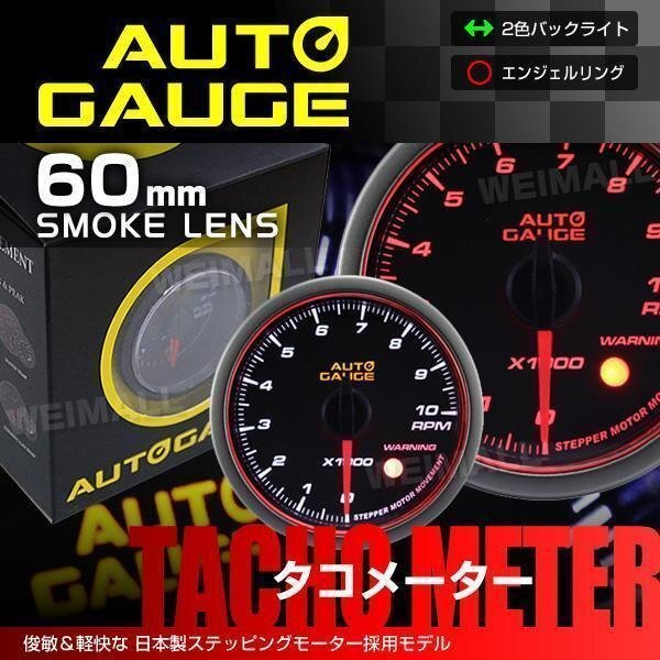 - 日本製モーター仕様 新オートゲージ タコメーター 60mm 追加メーター 静音 ワーニング機能 エンジェルリング 白 赤LED スモーク [458]
