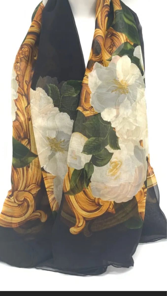 - シャネル 大判 シースルー スカーフ ストール カメリア 花柄 ブラック CHANEL