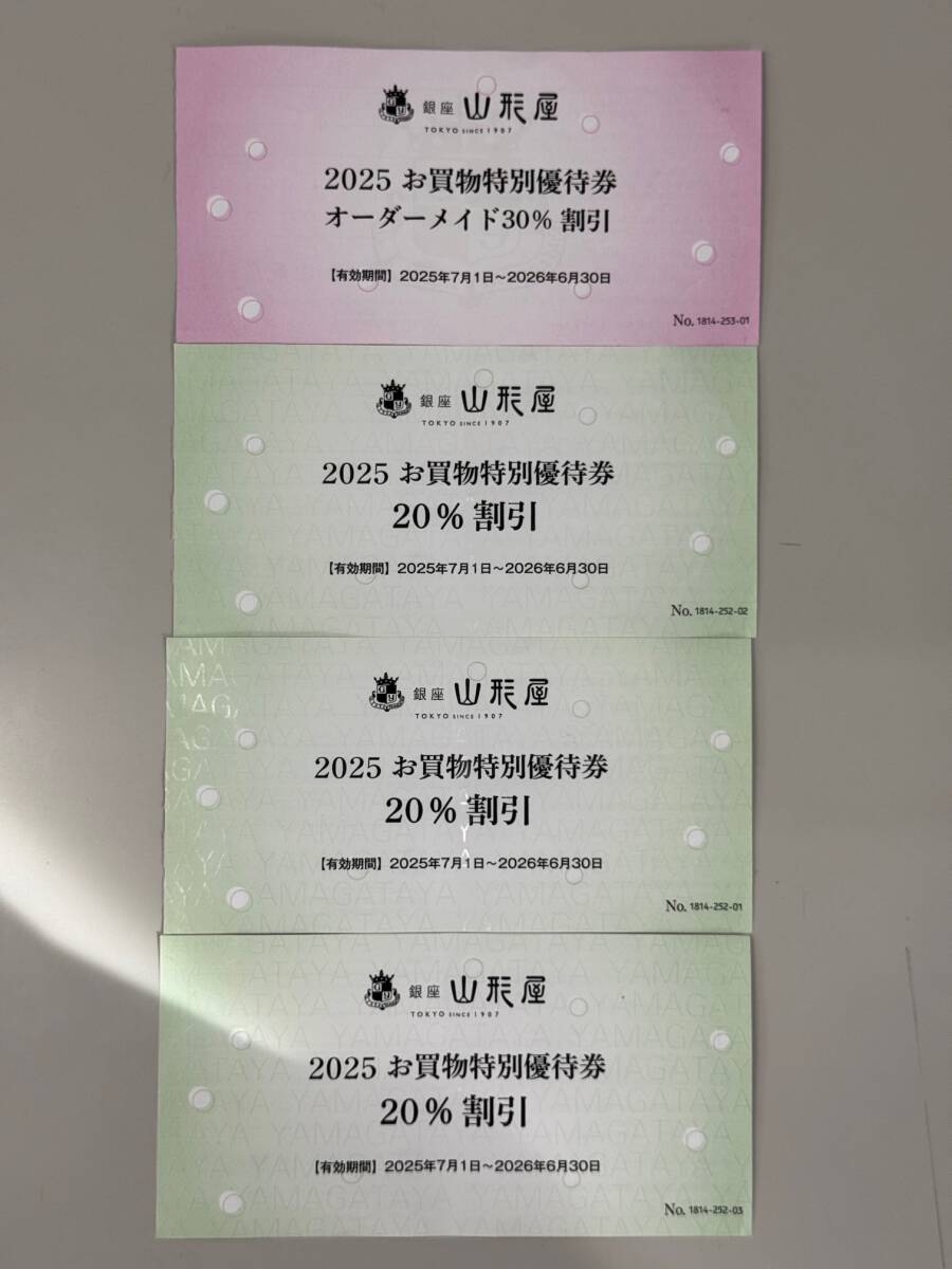 - 【銀座山形屋】2025 株主優待券 オーダーメイド30%×1枚、お買い物20%×3枚 合計4枚セット