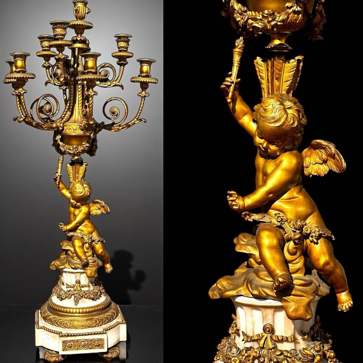 > 西欧アンティーク 特大キャンドルスタンド 天使の彫像 白石台真鍮製 大理石風 蝋燭台 オブジェ インテリア (92×36×33cm)20-25kg