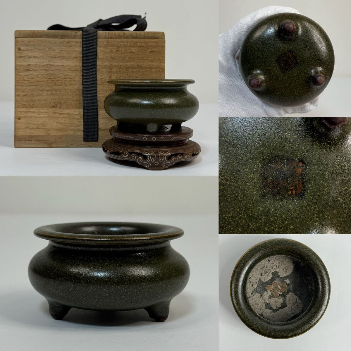 - X-中国古美術 時代物 香炉 香道具 蕎麦窯 茶葉末釉 三足炉 在銘 共箱付 台座付 唐物 陶磁器 中国古玩 骨董品