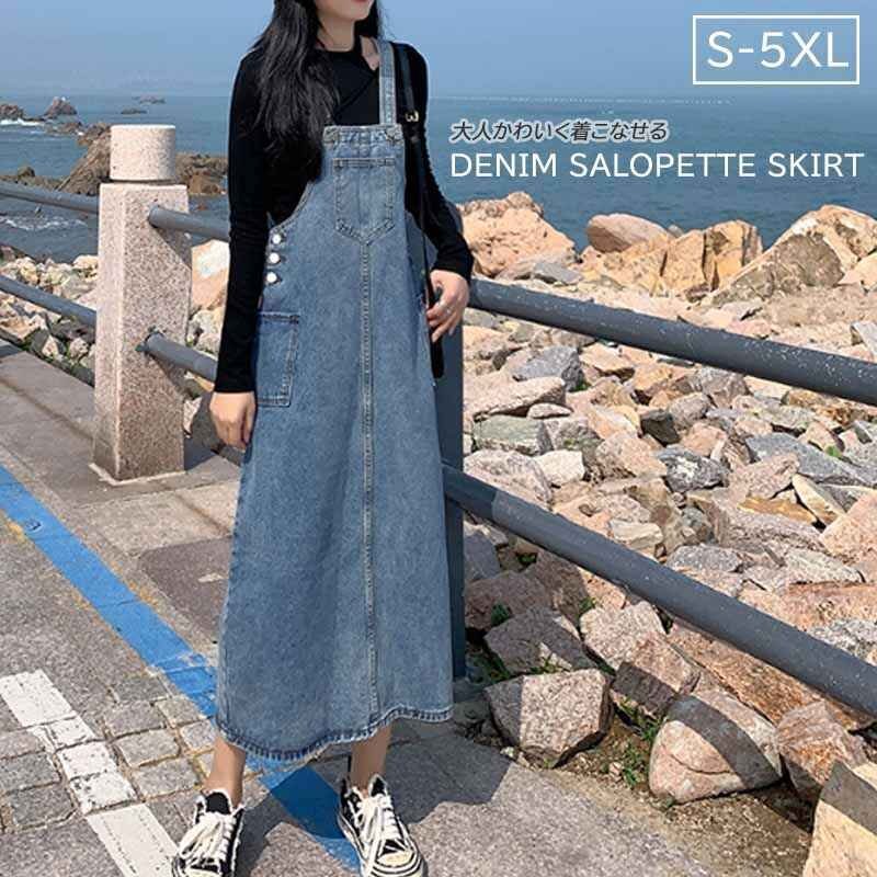 > レディース デニム サロペット オーバーオール 大きいサイズあり カジュアル ジャンパースカート マキシ 体型カバー XL ブルー