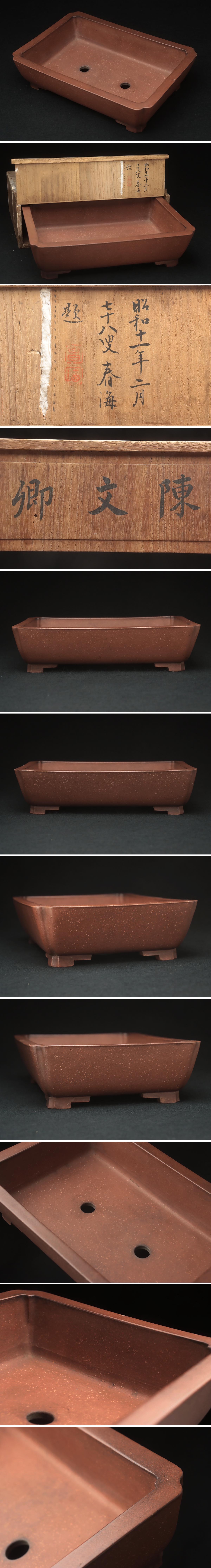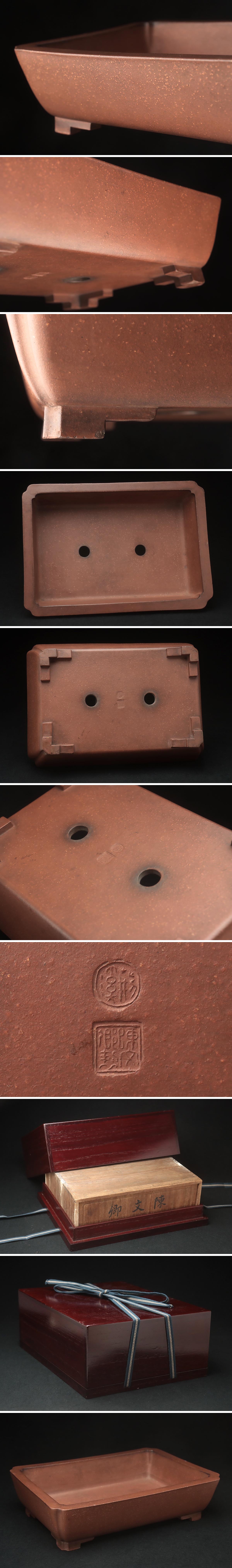 > FD111 中国宜興 紫砂【荊渓 陳文卿 款】梨皮朱泥隅切長方鉢・梨皮泥四方倭角花盆 幅25.9cm 二重共箱・植木鉢 盆栽鉢 中国古陶 古美術
