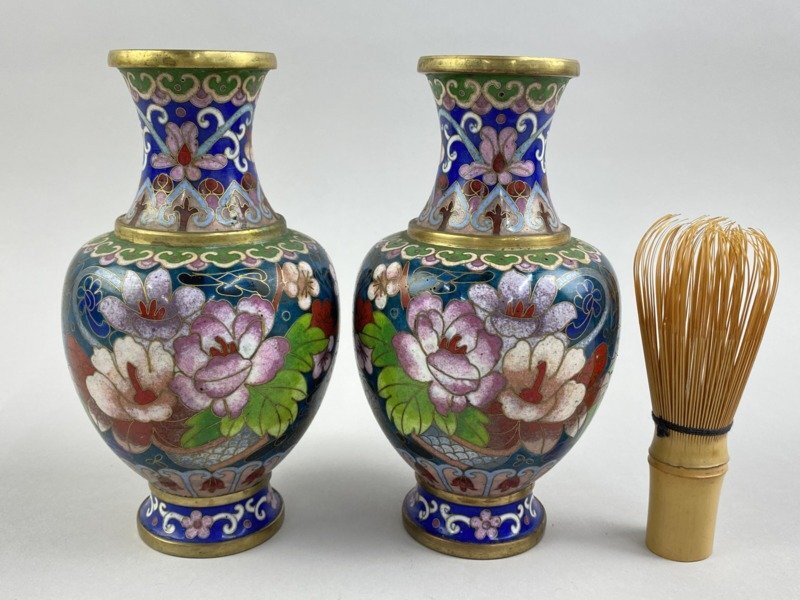- ac551 中国美術 銅七宝 花瓶 2点 一対 高さ16cm 花文 七宝 景泰藍 花器 飾壺 壷 花生 花入 置物 唐物 中国 古玩