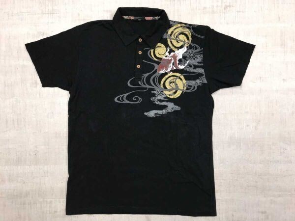 - バレットノイズ BULLET NOISE ストリート 豪華絢爛 和柄 金魚 雲 波模様 ラメ プリント 半袖ポロシャツ メンズ コットン100% LL 黒