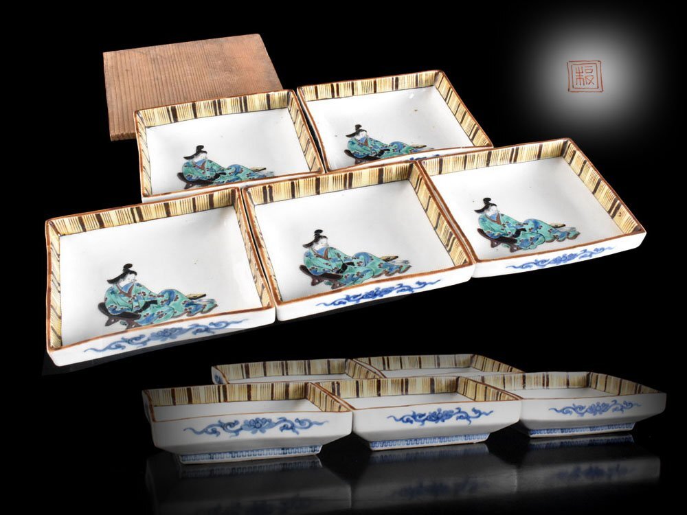 - 【雲】某名家買取品 古九谷 色絵 貴族人物絵付 角皿 5客 福印 箱付 古美術品(柿右衛門懐石料理道具 向付 旧家蔵出)Y7200 LTcdsw