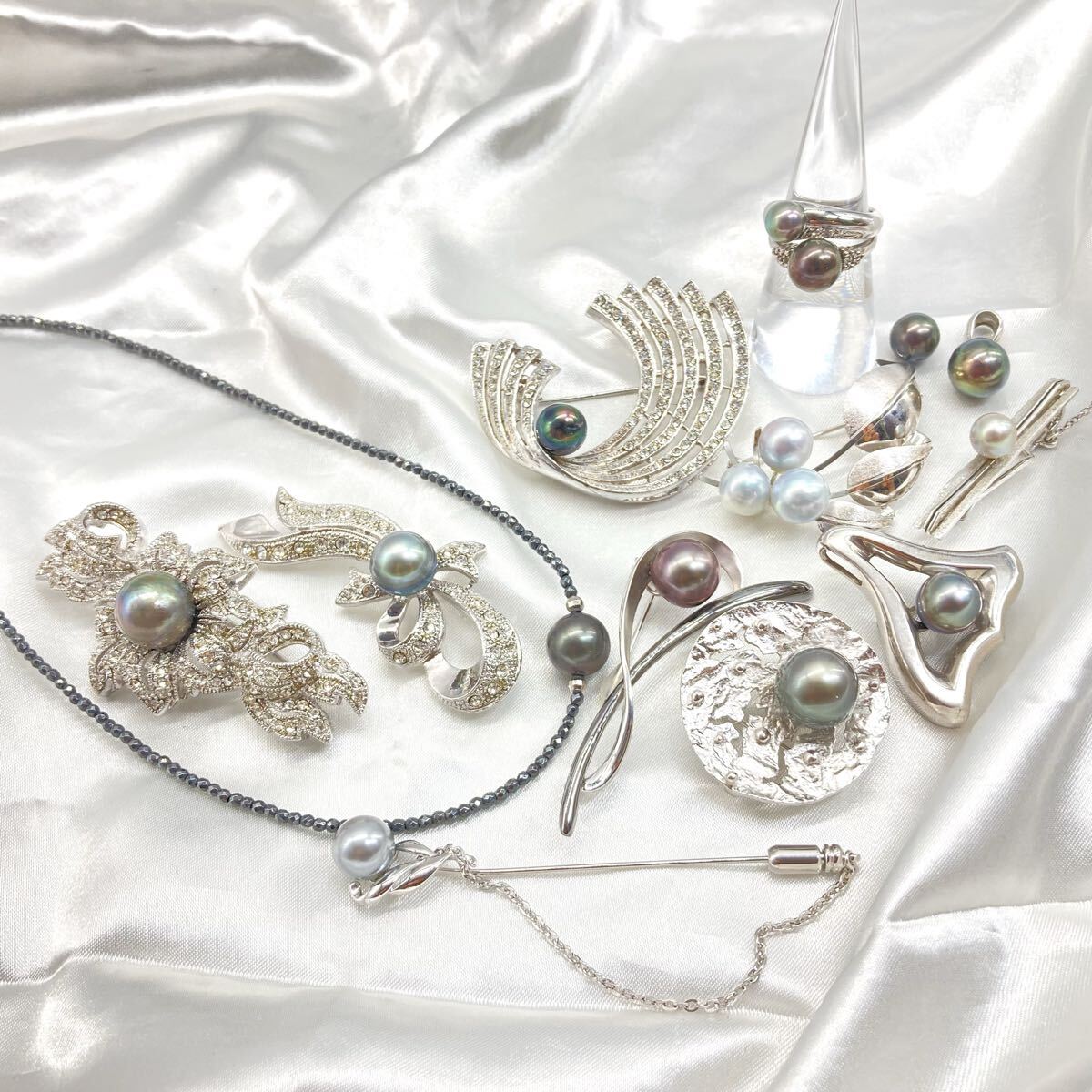 > 黒蝶真珠/ダイヤ入り!![アクセサリーおまとめ]n 約105.9g ネックレス リング ブローチ 南洋 アコヤ 本真珠 ブルー silver 925 C965
