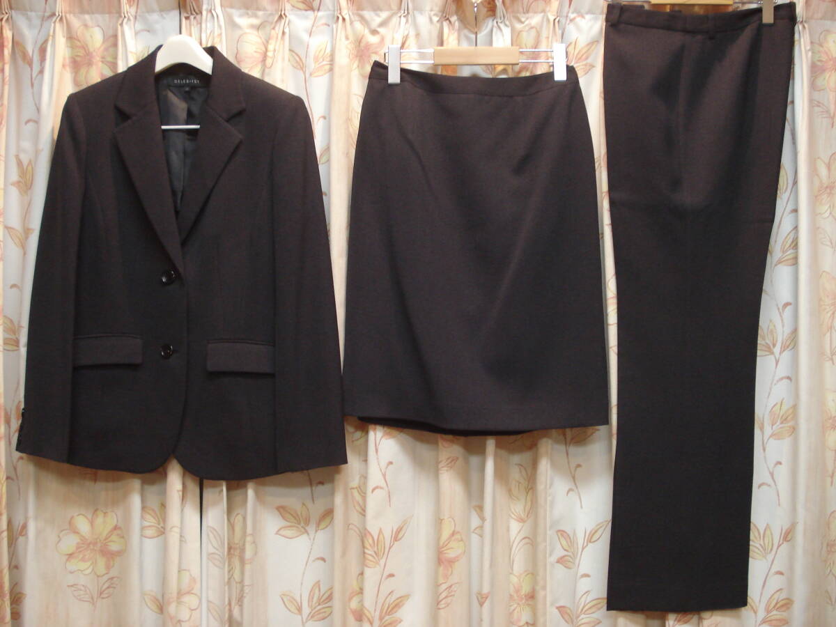 > 送料無料!美品!秋・冬・春もの!CELEB-IST!11号サイズ!ウェスト82cm!ダークグレー色!スカート&パンツシングルスーツ!3点セット!