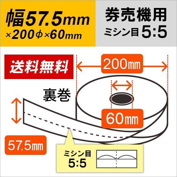 - 券売機用ロール紙 紙幅57.5×200×60 裏巻 白紙 (ミシン目5:5) 紙厚 150μ 5巻入 KT-124 / KT-130NN 卓上式券売機 対応 感熱ロール紙