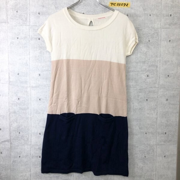 - PREFERIR レディース バックスリット リボン付き ニットワンピース M 白ベージュ紺