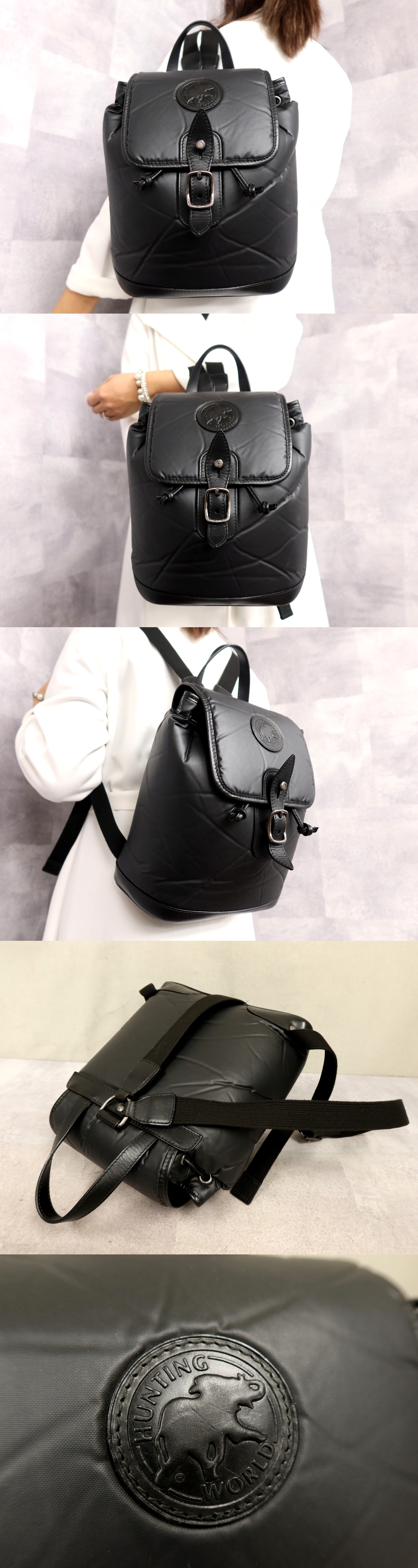 > 超美品●HUNTING WORLD ハンティング・ワールド●サファリ●ロゴ型押し●バチュークロス カーフ レザー 本革●リュックサック●黒●Js61847