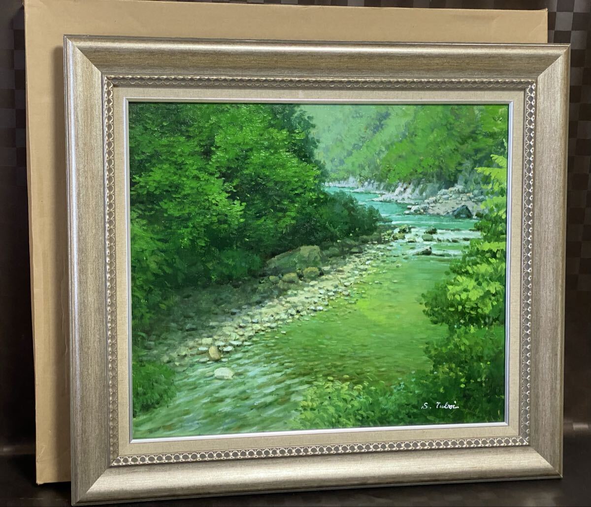 - 真作 油彩画 油絵 坪井志朗 【奈良川】 F10号 風景画 リアリズム 額縁 額装 インテリア