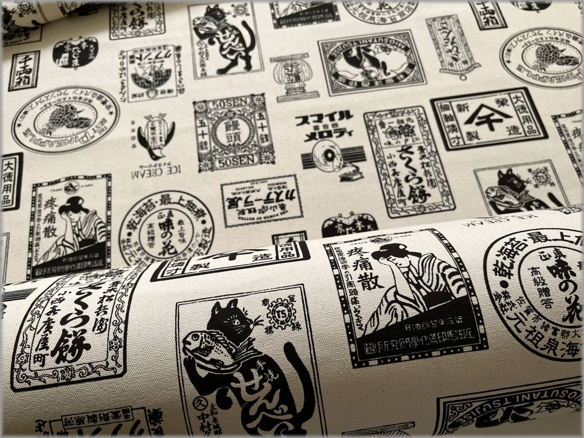 - mets★5m*8号帆布*昭和レトロ*生成り黒*パッケージ柄*生地布地3D