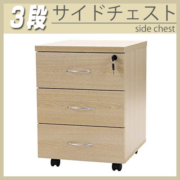 > 送料無料 3段 サイドチェスト 半完成品 約W40×D48.5×H55.5 鍵 キャスター オールロック サイドキャビネット サイドワゴン ナチュラル