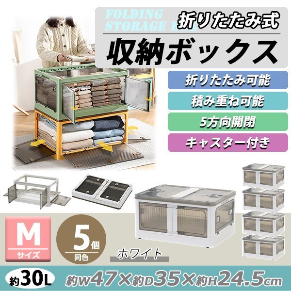- 送料無料 収納ボックス 折りたたみ 5個セット 約47×35×24.5cm Mサイズ 30L ホワイト キャスター付き 5面開閉 観音開き 積み重ね