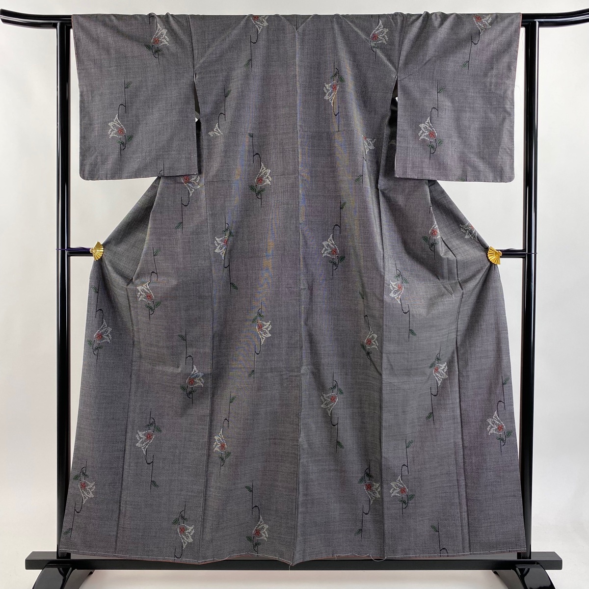 > 【美品】 紬 身丈157cm 裄丈63.5cm S 袷 証紙 草花 黒灰 正絹 秀品 【中古】
